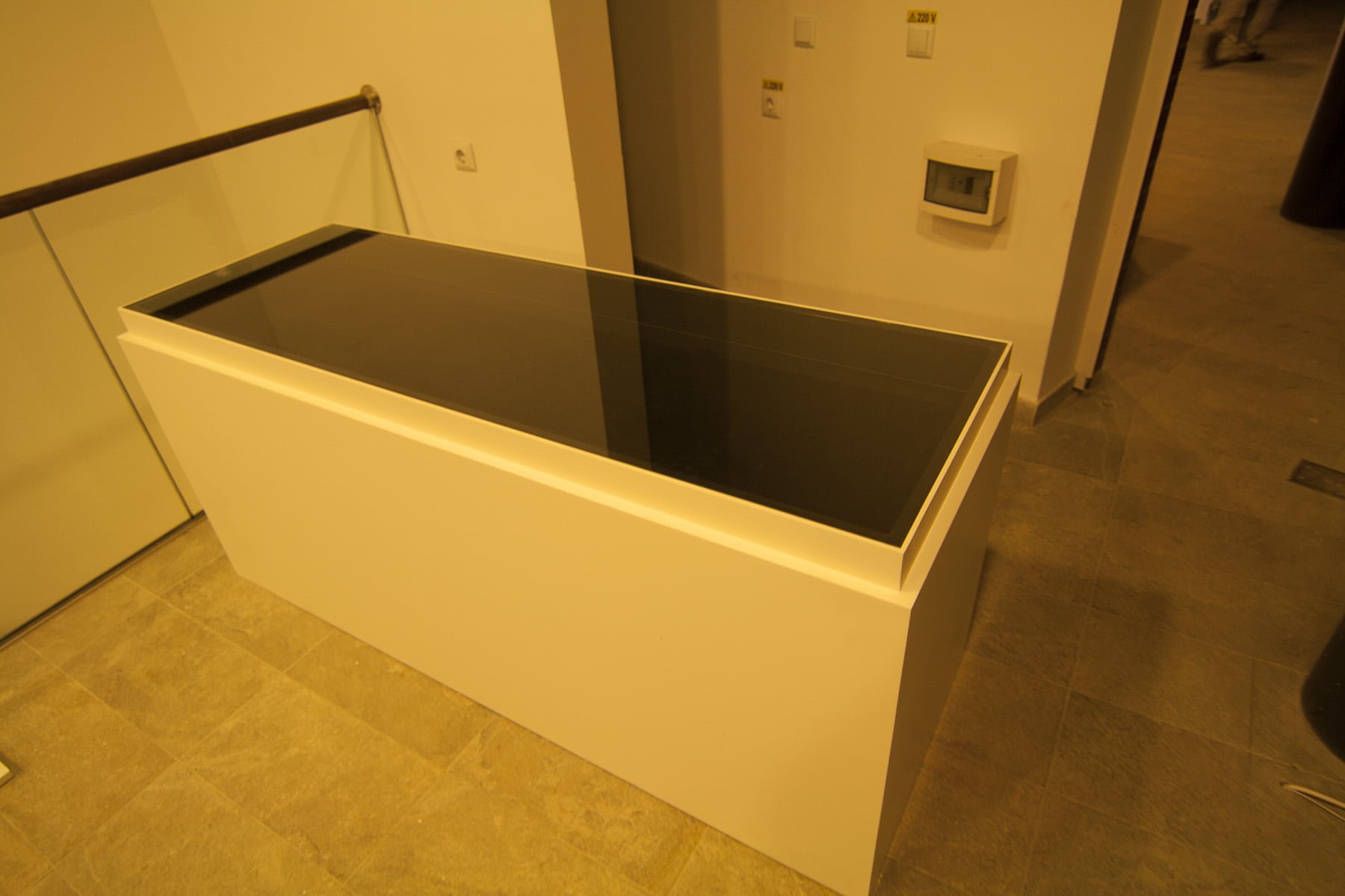 Desk de intampinare, informare, vitrine expunere si totemuri executate integral din corian culoare glacier white.