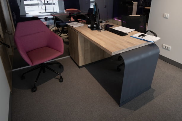 - Birouri operaționale: blat din lemn masiv (stejar) cu structură din tablă vopsită în câmp electrostatic;
